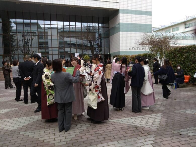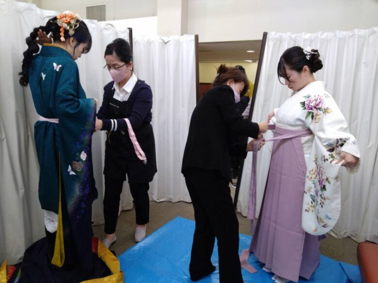 この「着崩れお直し」の支援は先生方も学生たちにも「安心して式に臨めます」と好評を得ています。直してもらった学生はにこやかに式場へ入っていきました。