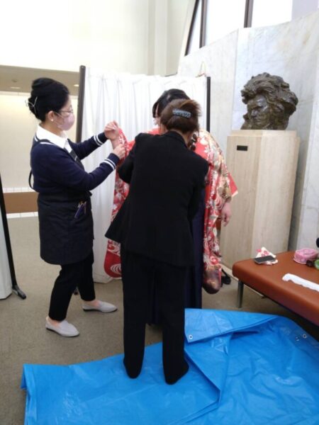 開成いすず会役員は午前9時から12時30分まで、大木副理事長、佐藤悦子理事、小林佳奈子常任理事、名倉副理事長、事務局小林が式場手前の「着崩れお直し所」に待機して着崩れした学生のお直しをしました。
